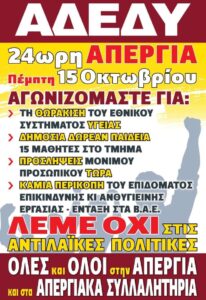 Το Γενικό Συμβούλιο της ΑΔΕΔΥ, στη συνεδρίασή του την Τρίτη, 6 Οκτωβρίου 2020, αποφάσισε την κήρυξη 24ωρης απεργίας σε όλο το Δημόσιο για την Πέμπτη, 15 Οκτωβρίου 2020 με τα εξής αιτήματα: