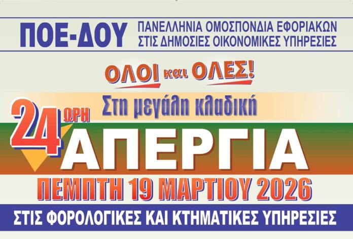 ΠΟΕ - ΔΟΥ: ΟΛΕΣ & ΟΛΟΙ ΣΤΗΝ ΜΕΓΑΛΗ ΚΛΑΔΙΚΗ ΑΠΕΡΓΙΑ ΤΗΝ ΠΕΜΠΤΗ 19.3.2026