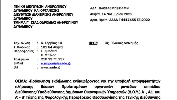 Πρόσκληση εκδήλωσης ενδιαφέροντος για την υποβολή υποψηφιοτήτων πλήρωσης θέσεων Προϊσταμένων οργανικών μονάδων επιπέδου Διεύθυνσης/Υποδιεύθυνσης Δημόσιων Οικονομικών Υπηρεσιών (Δ.Ο.Υ.) Α’, Α1′ και Α’- Β’ Τάξης της Φορολογικής Περιφέρειας Θεσσαλονίκης της Γενικής Διεύθυνσης Φορολογικής Διοίκησης (Γ.Δ.Φ.Δ.) της Ανεξάρτητης Αρχής Δημοσίων Εσόδων (ΑΑΔΕ)
