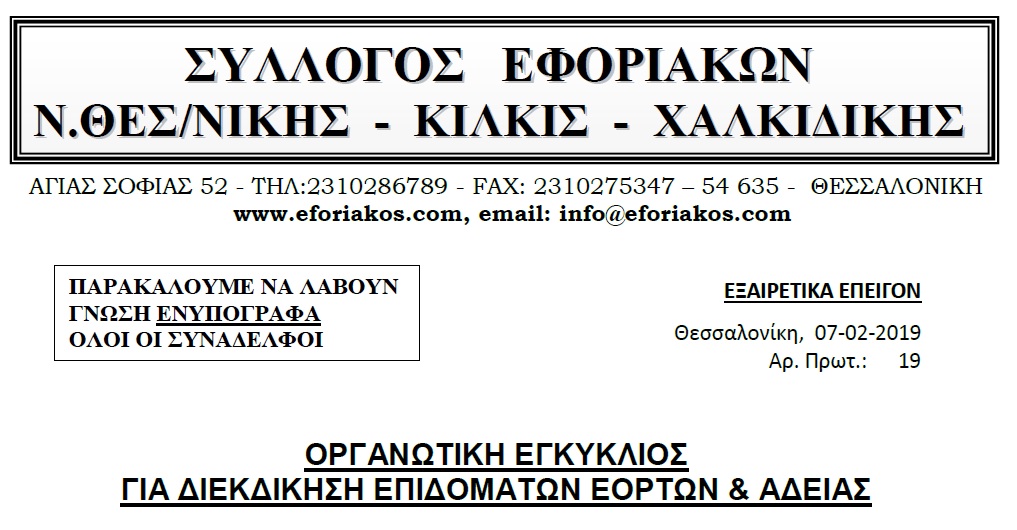 Για την ορθή ενημέρωση των μελών σχετικά με την πορεία της αγωγής και την αποστολή των Α.Π.Υ., παρακαλούνται οι υπηρεσίες να αποστείλουν ηλεκτρονικά ονομαστική κατάσταση μελών, ως συνημμένο υπόδειγμα, στο info@eforiakos.com